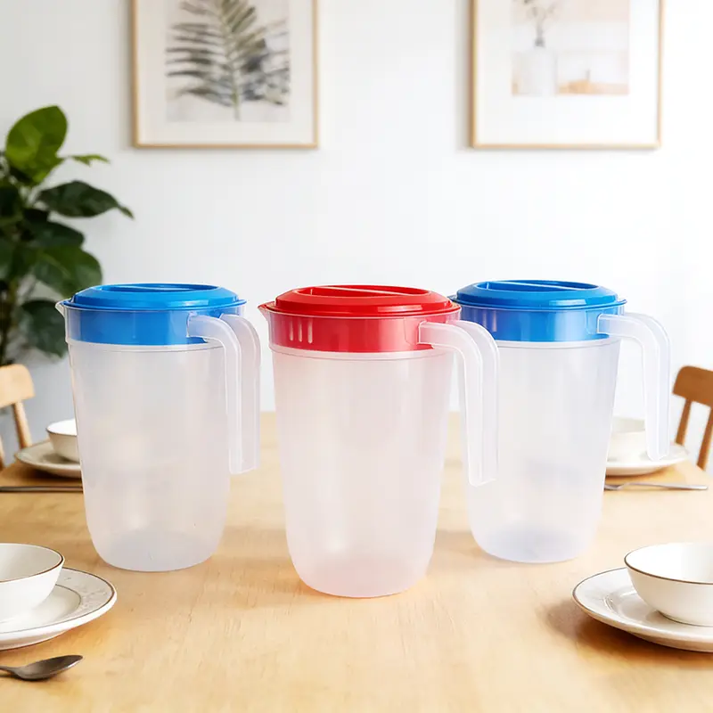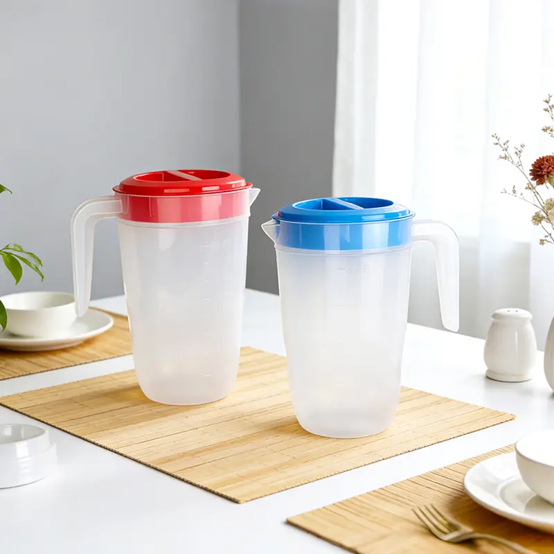 Este jarro de plástico comercial avançado 2L PP de baixo preço para lojas de bebidas foi projetado especificamente por Ningbo Powerr para lojas de bebidas. Este jarro de plástico semitransparente branco leite é feito de PP para contato com alimentos, apresentando um acabamento fosco macio que permite verificar claramente o nível da água, evitando a aparência fria das versões totalmente transparentes. Suas tampas arredondadas vermelhas ou azuis adicionam um toque brilhante, combinando perfeitamente com estilos nórdicos, rústicos e outros estilos de casa. Projetada para ser prática, a alça larga e curva permite segurar sem esforço com uma mão. A ranhura direcionadora do fluxo da tampa garante um vazamento suave e sem derramamentos, reduzindo o trabalho de limpeza da mesa. Com linhas elegantes e fundo estreito, cabe perfeitamente nas prateleiras das portas da geladeira sem ocupar espaço extra. A capacidade de 2 litros atinge um equilíbrio, atendendo às necessidades comerciais e ao mesmo tempo sendo fácil de manusear pelo pessoal.