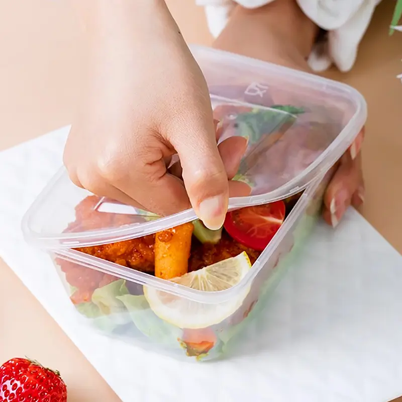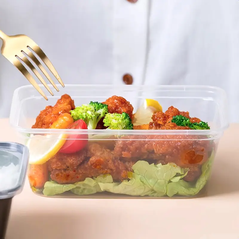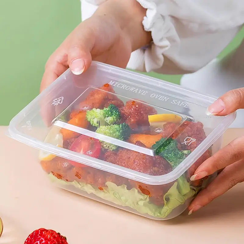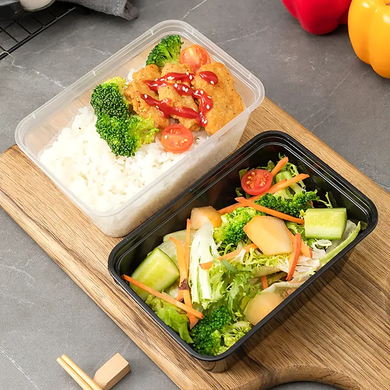 Ningbo Powerr fornece recipiente para alimentos de plástico retangular transparente de baixo preço de 750ml na China. Feito de material seguro, comporta refeições quentes, pode ser refrigerado ou colocado no micro-ondas por breves instantes, sem odor ou deformação. Sua capacidade dourada de 750ml cabe perfeitamente na refeição completa de uma única pessoa, acomodando pratos principais e acompanhamentos sem desperdícios. A base e a tampa hermeticamente fechadas evitam vazamentos de sopa, adequadas para alimentos picantes. Seu design superior mais largo e inferior mais estreito garante um empilhamento estável, conveniente para a preparação a granel dos comerciantes e armazenamento dos usuários, ao mesmo tempo que maximiza o espaço. As versões transparentes mostram os alimentos com clareza, as pretas escondem os resíduos; cores personalizadas, impressão e novas ferramentas também estão disponíveis.