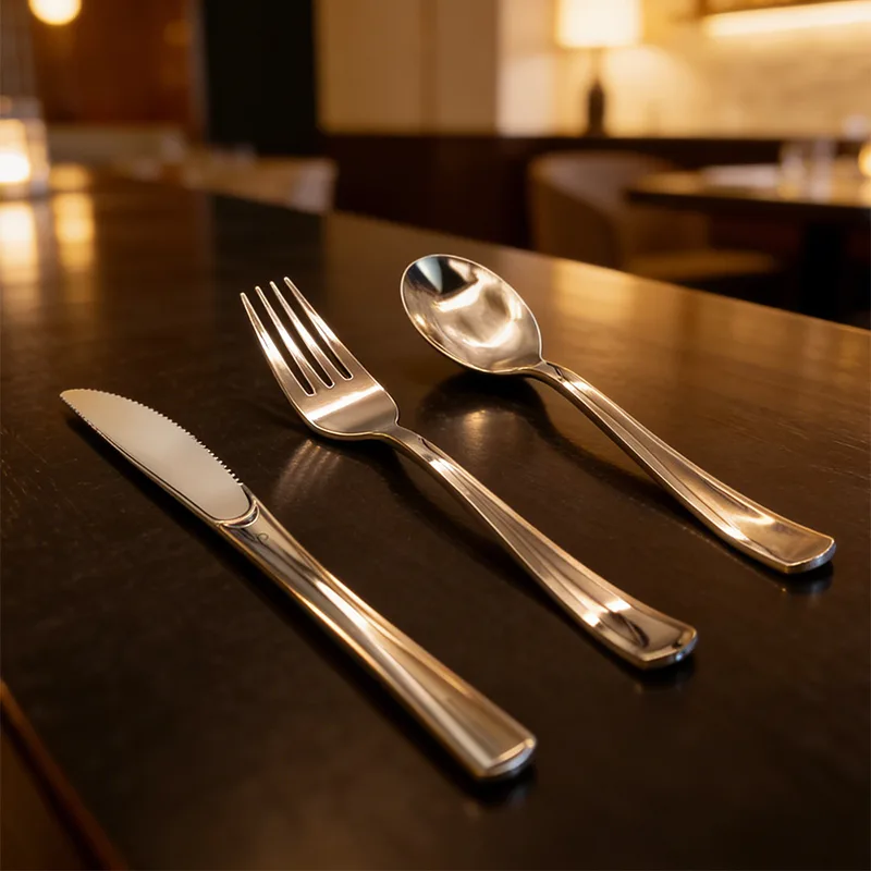 Facas de festa clássicas, garfos, colheres, talheres de plástico são amplamente aplicáveis. Nos banquetes de casamento, o estilo metálico pode ser combinado com a decoração do casamento para realçar a elegância geral e se tornar o destaque da mesa; em reuniões de negócios, o design simples e requintado pode se adequar à atmosfera formal do ambiente de negócios, destacando a qualidade; em festas familiares e reuniões de amigos, o método de uso conveniente também pode adicionar uma sensação de cerimônia ao jantar. Além disso, o produto também é adequado para festas ao ar livre, celebrações de festivais, reuniões anuais corporativas, etc. O recurso leve e durável pode efetivamente evitar riscos de danos quando usado ao ar livre.