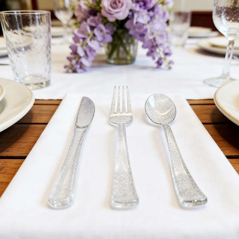 Facas de festa clássicas, garfos, colheres, talheres de plástico
